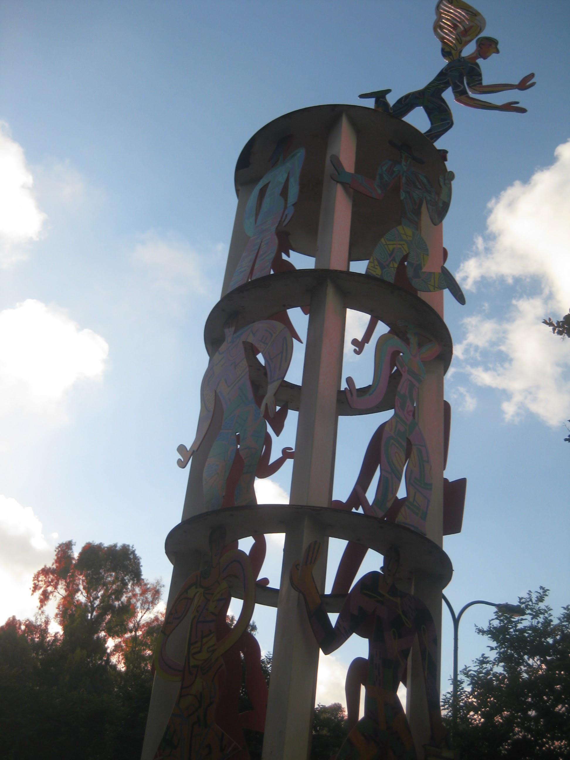 The sculpture , donated to the city by the internationally renowned israeli painter and sculptor, David Gerstein , is made of a laser cut metal frame, and hand-painted wooden figures (one in each of the spaces) in playful daily life scenes. On top of it, a human figure symbolically pointing at the sky.